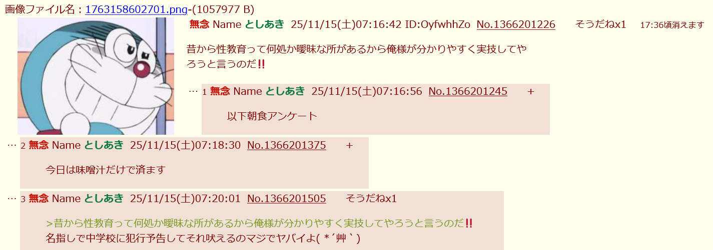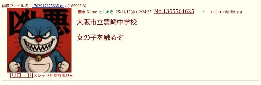 | … | 24無念Nameとしあき25/11/16(日)19:29:40No.1366606837そうだねx4 1763288980645.png-(289926 B) 本当に存在する中学校の名前出してセクハラ予告する奴が正義ねぇ… |